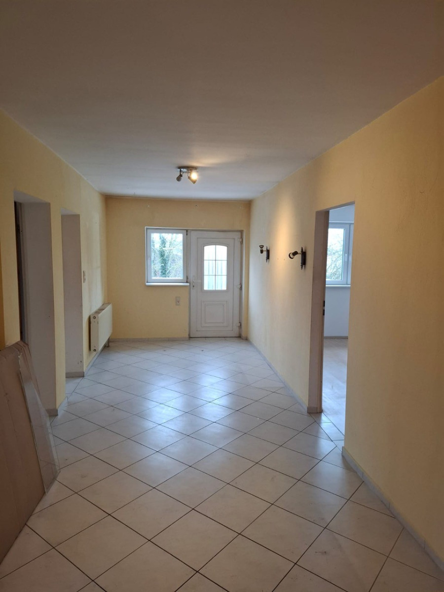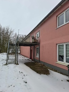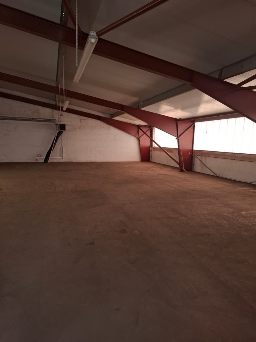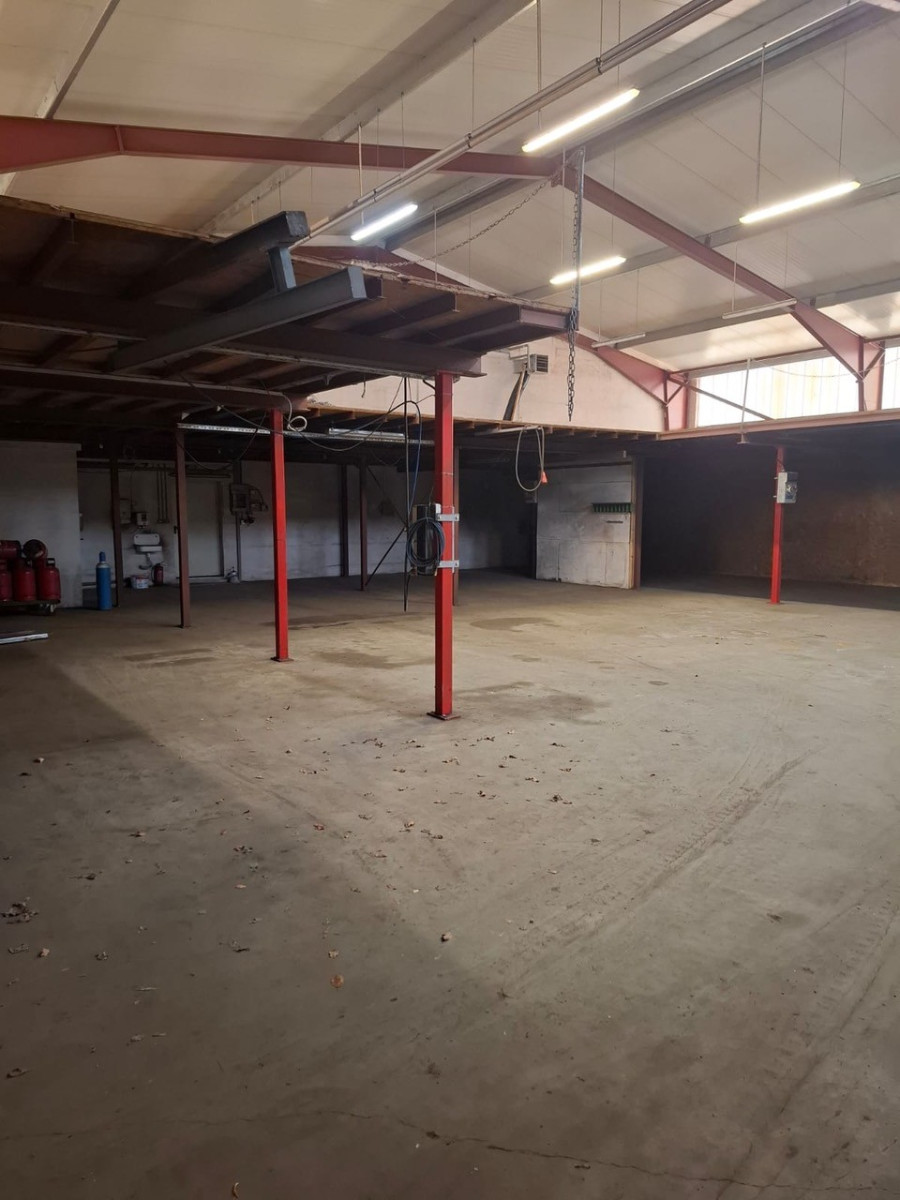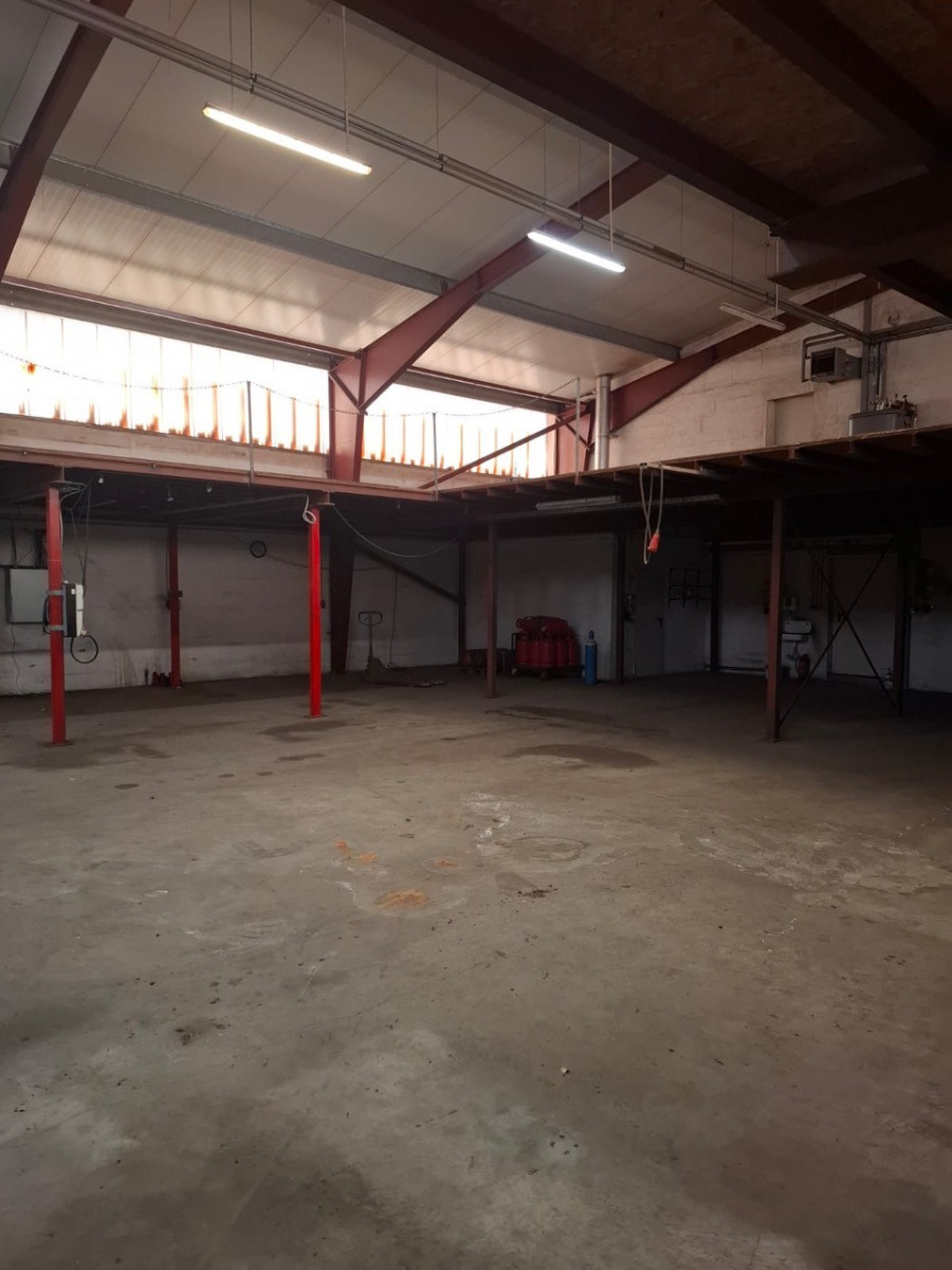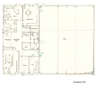 Die Halle wurde 2001 massiv gebaut, ist mit einem flach geneigten Dach erstellt und gedämmt. Der untere Hallenbereich besitzt eine Lagerfläche von insgesamt ca. 400 m². Auf einer zweiten Lagerebene, die über eine Treppe erreichbar ist, stehen ca. weitere 250 m² Lagerfläche zur Verfügung. Die gesamte Halle ist beheizbar, eine Heizung sowie Strom (230V+400V) und Beleuchtung sind vorhanden An der Westseite befindet sich ein Rolltor mit Laderampe. In die Halle wurde ein massiver Bürokomplex eingebaut, der sich über zwei Etagen erstreckt und eine Grundfläche von ca. 250m² aufweist. Im Erdgeschoss befinden sich vier Büros. Ein fünftes Büro wurde durch den Vormieter als Werkstatt genutzt, könnte aber auch wieder als Büro genutzt werden. Ein Glasfaseranschluss für schnelles Internet ist ebenfalls vorhanden. Zu den Büros gelangt man über einen großzügigen Empfangsbereich mit Windfang und Eingangsdiele. Es sind außerdem zwei Küchen sowie ein Abstellraum vorhanden. Nach Bedarf kann eine Betriebsleiterwohnung ausgewiesen werden. .